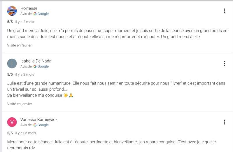 Julie est une personne très douce, toujours dans l'écoute, et très rigoureuse dans son approche tout en restant ouverte et sans jugement. Elle m'a parfaitement guidée lors de la séance pour parvenir à décrypter certaines émotions que je ne comprenais pas et pouvoir mieux les appréhender. Je me suis de suite sentie plus "légère" et je pense que les bienfaits s'en feront sentir sur le long terme. Merci à toi Julie pour ton accompagnement ☺️